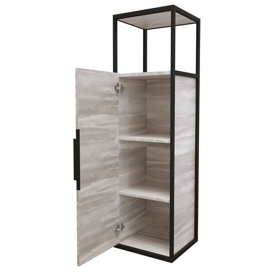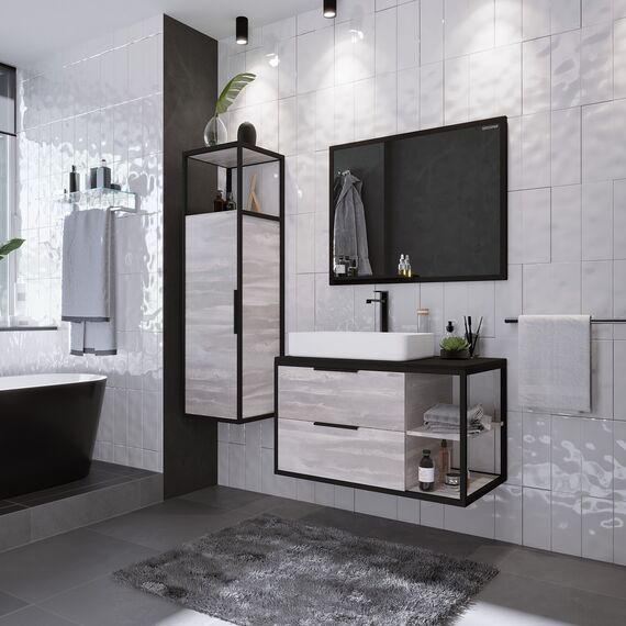 Подвесной пенал Лофт-90 образует дополнительное пространство для хранения средств гигиены и аксессуаров, обеспечивая максимальную эргономичность ванной комнаты. Внутреннее пространство пенала поделено полками на 3 секции. Интегрированный профиль из анодированного металла придадст интерьеру брутальности, присущий стилю лофт.Дверь снабжена мезанихмом плавного закрывания. Корпус и фасады пенала выполнены из влагостойкого ЛДСП, устойчивого к перепадам температур и высокой влажности, крепится к стене. Ручка и подвесы для крепления тумбы - в комплекте.