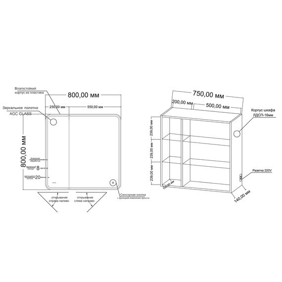 Все электрические компоненты размещены внутри корпуса из полистирола. В качестве элемента подсветки используется светодиодная лента с плотностью диодов 150 шт./м мощностью 9,6 Вт/м, что обеспечивает яркое свечение по периметру зеркала. Срок службы диодов - 30000 часов. Управление подсветкой осуществляется сенсорным выключателем, расположенным с права на зеркале.