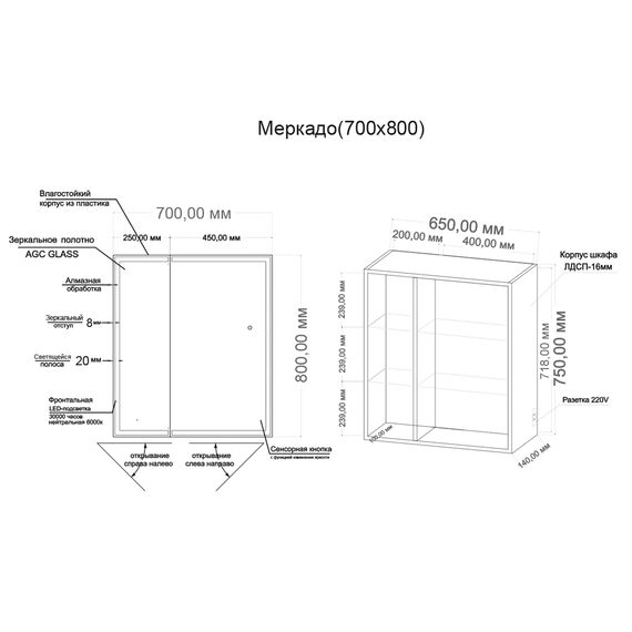 Шкаф-зеркало "МЕРКАДО-70 см" Пр. с LED подсветкой
