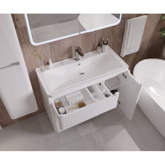 Тумба выполнена из влагостойкого МДФ покрытая белой глянцевой краской, устойчивая к перепадам температур и высокой влажности, крепится к стене.