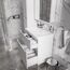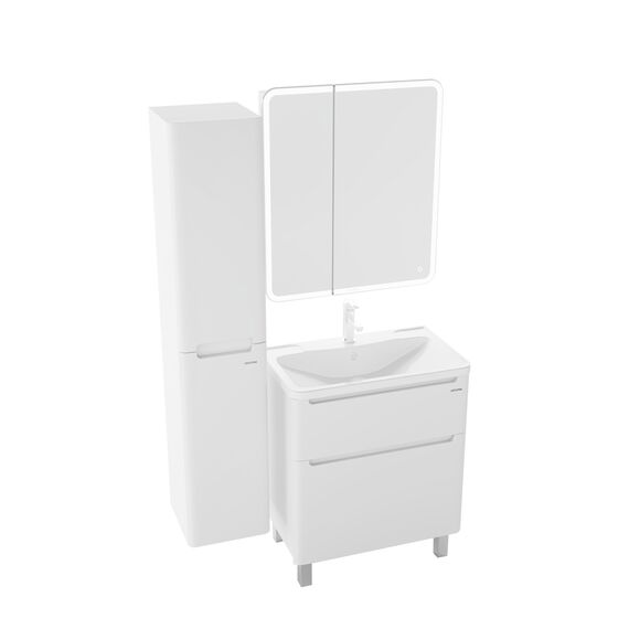 Тумба выполнена из влагостойкого МДФ покрытая белой глянцевой краской, устойчивая к перепадам температур и высокой влажности, крепится к стене.