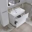 Тумба выполнена из влагостойкого МДФ покрытая белой глянцевой краской, устойчивая к перепадам температур и высокой влажности, крепится к стене.