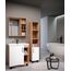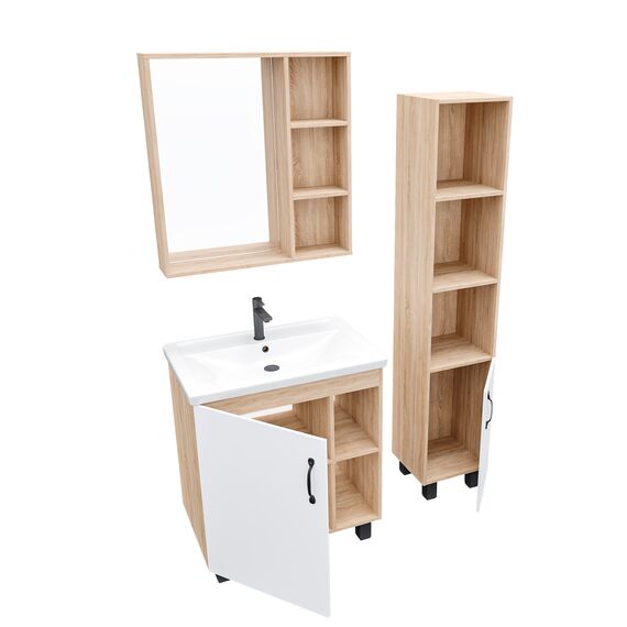 В тумбе Флай 60 см сочетаются контрастные цвета и фактуры: белый матовый фасад с покрытием SoftTouch, корпус цвета дуба с текстурой, черная матовая фурнитура. Открытые полки справа обеспечивают быстрый доступ к аксессуарам, а пространство за распашной дверцей, снабженной системой плавного закрывания, станет удобным местом для хранения бытовых принадлежностей.