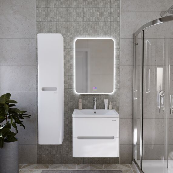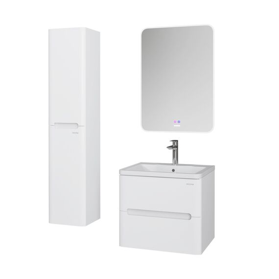 Тумба выполнена из влагостойкого МДФ покрытая белой глянцевой краской, устойчивая к перепадам температур и высокой влажности, крепится к стене и занимает мало места.