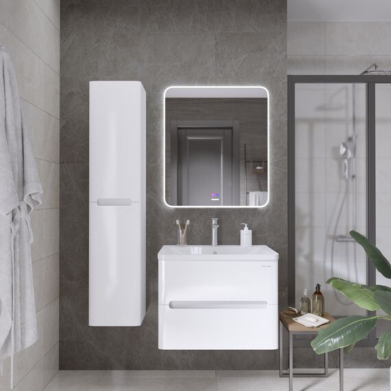 Тумба выполнена из влагостойкого МДФ покрытая белой глянцевой краской, устойчивая к перепадам температур и высокой влажности, крепится к стене и занимает мало места.