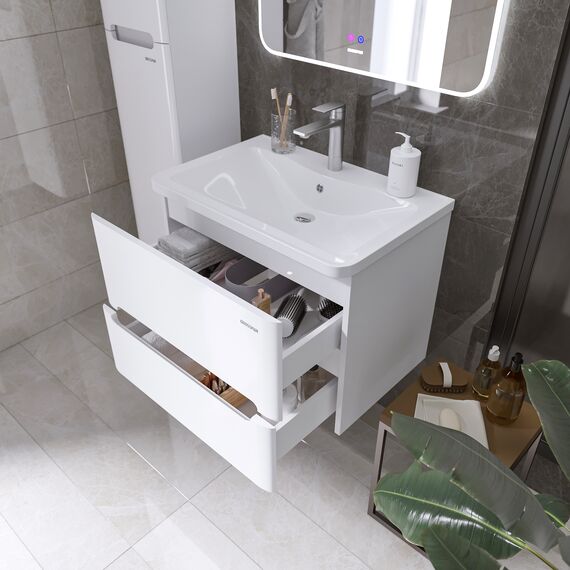 Тумба подвесная Адель 70 см -в белом глянцевом цвете, интегрированные ручки добавляют современный дизайн и строгий стиль.Тумба снабжена двумя ящиками, которые укомплектованы направляющими плавного закрывания, ящики предназначены для хранения различных предметов.