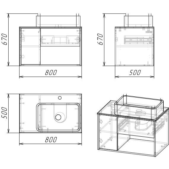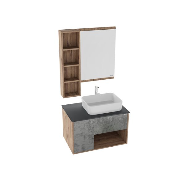 Корпус тумбы выполнен из влагостойкого ЛДСП, фасады ящиков и двери - из МДФ в матовой пленке, столешница МДФ в матовой пленке в цвете графит, устойчивых к перепадам температур и высокой влажности, крепится к стене.