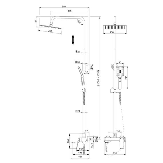 - Телескопическая душевая стойка позволяет изменять высоту до 165 см, что делает использование комфортным для людей разного роста.