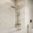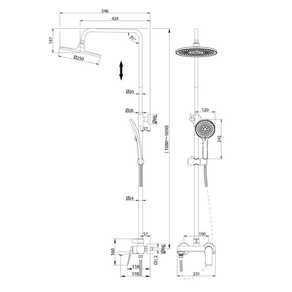 - Телескопическая душевая стойка позволяет изменять высоту до 165 см, что делает использование комфортным для людей разного роста.