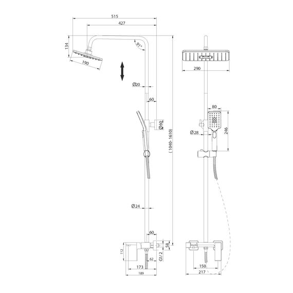 - Телескопическая душевая стойка позволяет изменять высоту до 165 см, что делает использование комфортным для людей разного роста.