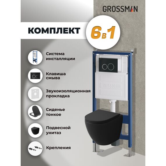 Комплект 3 в 1: Grossman инсталляция 900.K31.01.000+клавиша 700.K31.01.210.210 черный матовый+унитаз GR-4455BMS, 3 места