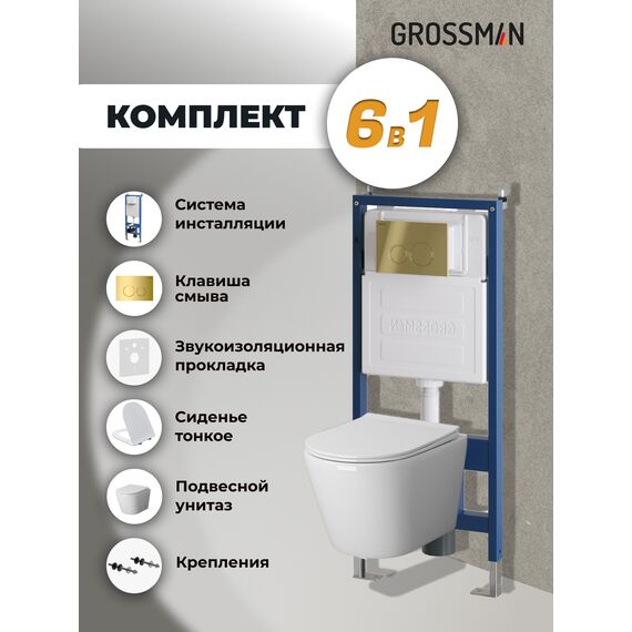 Комплект 3 в 1: Grossman инсталляция 900.K31.01.000+клавиша 700.K31.01.300.300 золото глянцевый+унитаз GR-4478SQ, 3 места