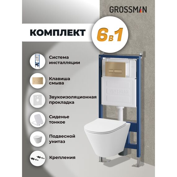 Комплект 3 в 1: Grossman инсталляция 900.K31.01.000+клавиша 700.K31.03.310.310 золото матовый+унитаз GR-4477S, 3 места