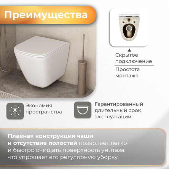 - Быстрая уборка, за счет отсутствия ободка, в котором скапливается грязь;